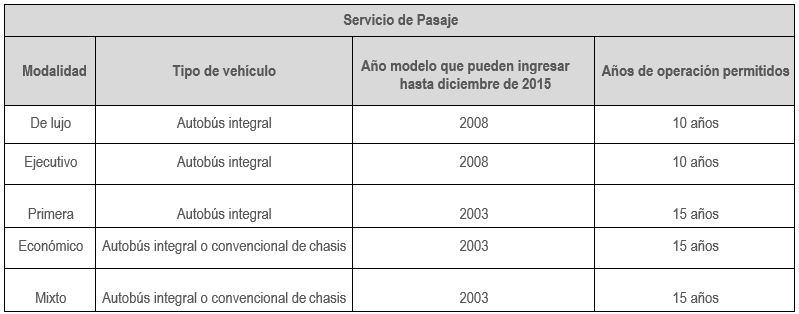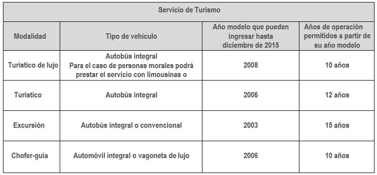 Para el servicio de autotransporte federal de carga, no existe límite de operación de los vehículos. El servicio de autotransporte federal de turismo, será susceptible de autorizarse de acuerdo al tipo de unidad y modelos siguientes: