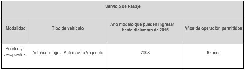 En el caso del servicio de transportación terrestre de pasajeros de y hacia los puertos marítimos y aeropuertos, será susceptible de autorizarse de acuerdo al tipo de unidad y modelos siguientes:
